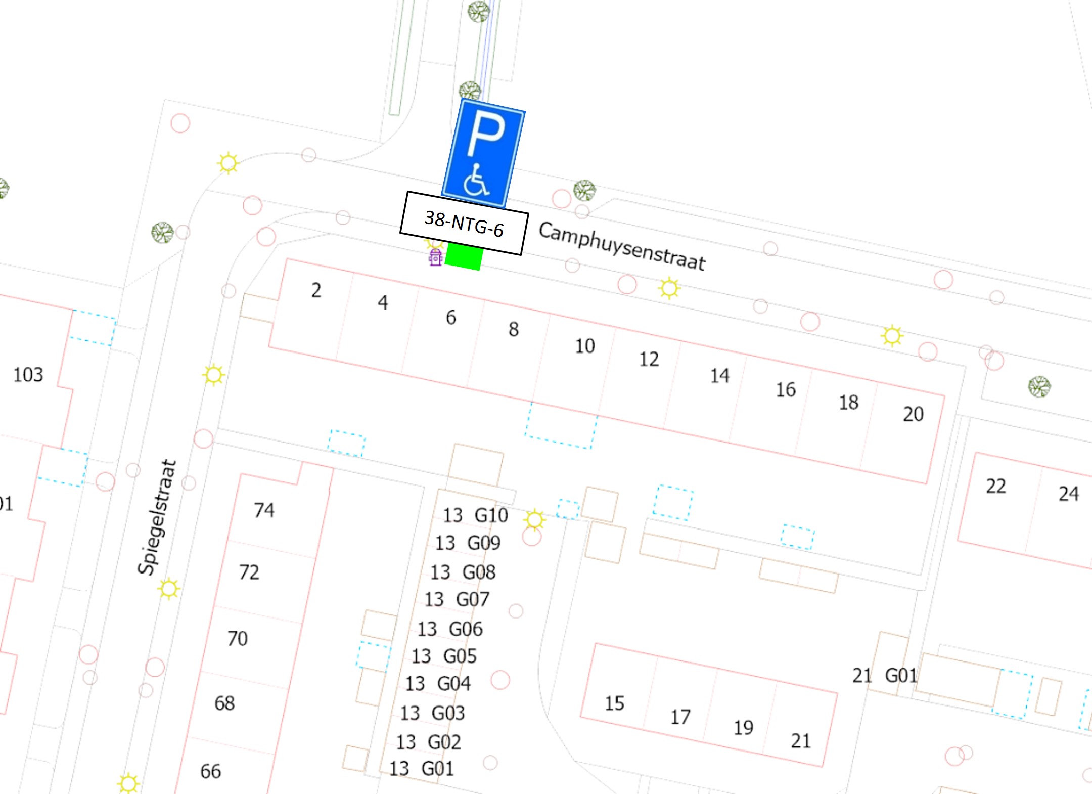 Het aanwijzen en inrichten van een gehandicaptenparkeerplaats op kenteken aan de Camphuysenstraat ter hoogte van perceel 6, door het plaatsen van het verkeersbord E6 van het RVV 1990 met onderbord met kenteken 38-NTG-6 zoals is aangegeven op de overzichtstekening in dit besluit.