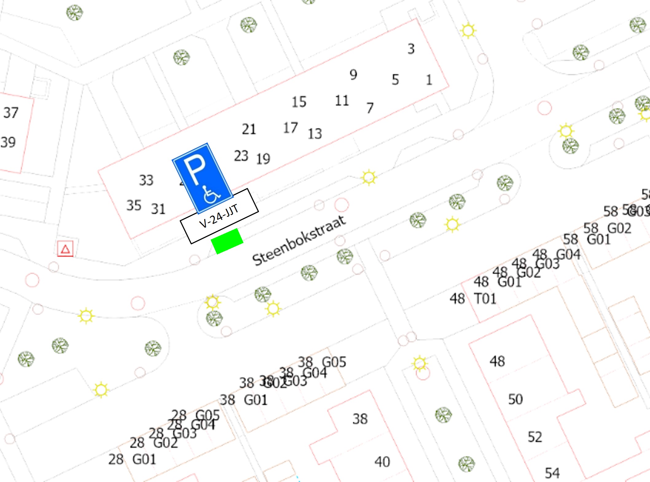 Het aanwijzen en inrichten van een gehandicaptenparkeerplaats op kenteken aan de Steenbokstraat, nabij nr. 5, door het plaatsen van het verkeersbord E6 van het RVV 1990 met onderbord, met kenteken V-24-JJT, zoals is aangegeven op de overzichtstekening in dit besluit.