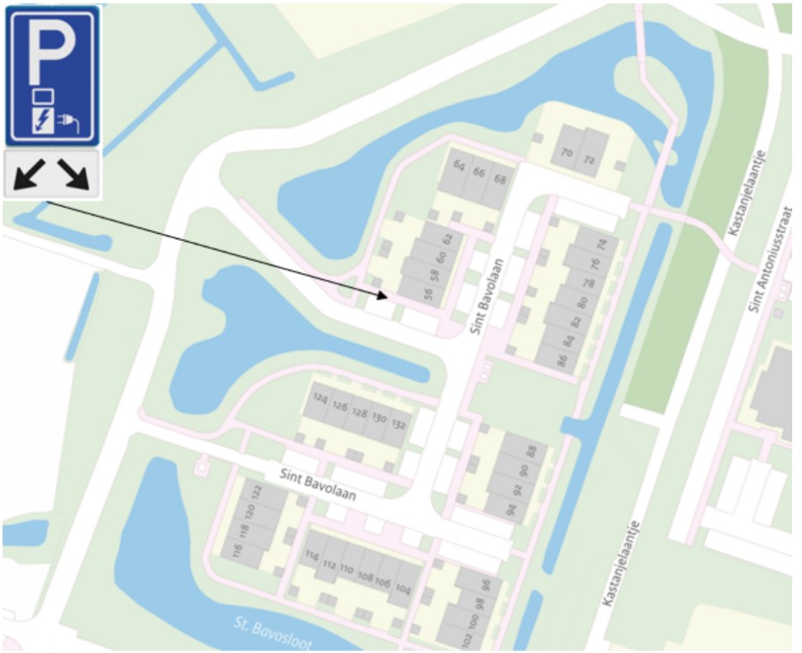 - dit bereikt kan worden door het plaatsen van verkeersbord E08c uit Bijlage 1 van het RVV 1990 met het onderbord OB504 (twee (2) pijlen ter aanduiding waar elektrische voertuigen opgeladen kunnen worden);
