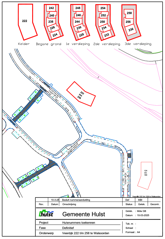 Aan de Veerdijk 222 in Walsoorden is er een vergunning verleend voor de bouw van 18 logiesappartementen. In verband met de verkoop van de afzonderlijke verblijfsobjecten, is het noodzakelijk dat alle verblijfsobjecten worden voorzien van een huisnummer.