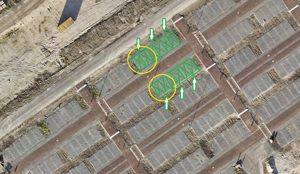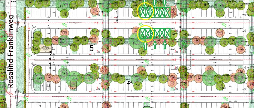 Voor de geel omcirkelde parkeervakken zijn de voorbereidingen al begonnen, de verwachting is dat deze laadpa len na jaar 2025 word en geplaatst.