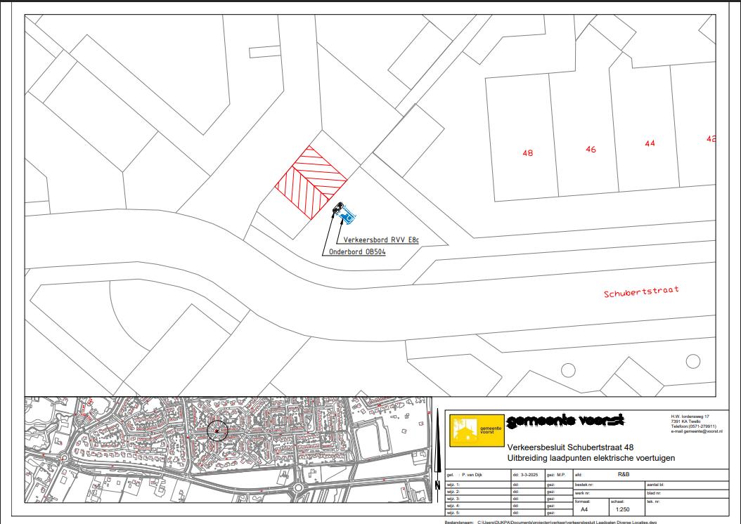 met het plaatsen van verkeersbord E8c van bijlage 1 van het Reglement verkeersregels en verkeerstekens 1990 (parkeergelegenheid alleen bestemd voor het opladen van elektrische voertuigen), voorzien van het onderbord OB504 (geldt voor twee vakken) en het aanbrengen van belijning twee parkeervakken nabij het adres Schubertstraat 48 in Twello te reserveren als parkeergelegenheid bestemd voor het opladen van elektrische voertuigen.