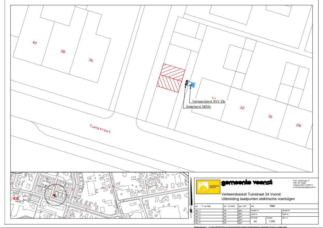 met het plaatsen van verkeersbord E8c van bijlage 1 van het Reglement verkeersregels en verkeerstekens 1990 (parkeergelegenheid alleen bestemd voor het opladen van elektrische voertuigen), voorzien van het onderbord OB504 (geldt voor twee vakken) en het aanbrengen van belijning twee parkeervakken nabij het adres Tuinstraat 34 in Voorst te reserveren als parkeergelegenheid bestemd voor het opladen van elektrische voertuigen.