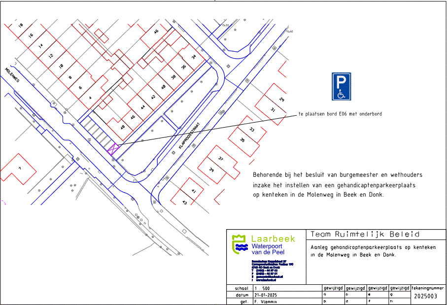 dat op 20 januari 2025 door een bewoner uit de Klaproosstraat een verzoek is gedaan voor het instellen van een gehandicaptenparkeerplaats op kenteken aan de Molenweg in Beek en Donk;