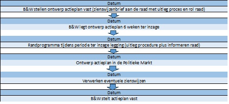 De uniforme voorbereidingsprocedure van afdeling 3.4 Algemene wet bestuursrecht is van toepassing op de vaststelling van het actieplan omgevingslawaai. Een ieder heeft zienswijzen naar voren kunnen brengen over het ontwerp actieplan omgevingslawaai. Ook de gemeenteraad van de gemeente Almelo is hiertoe in de gelegenheid gesteld. Het college van de gemeente geeft vervolgens een reactie op de zienswijzen en stelt het definitieve actieplan omgevingslawaai vast.