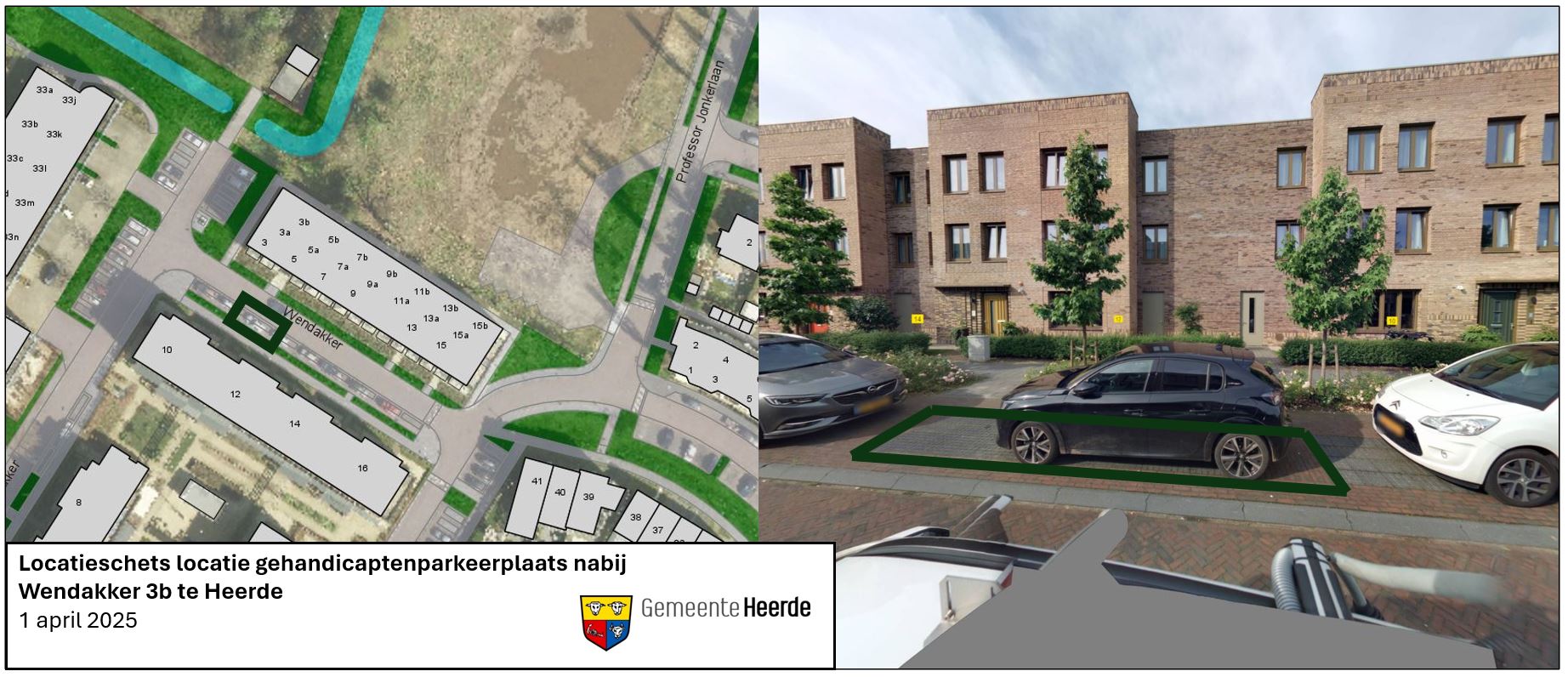 • aan de Wendakker 3b te Heerde nabij de woning aan de Wendakker 3b een gehandicaptenparkeerplaats in te richten voor een motor- of invalidenvoertuig dat door of ten behoeve van het vervoer van invaliden wordt gebruikt door plaatsing van bord E06 van bijlage 1 van het Reglement Verkeersregels en Verkeerstekens 1990 (RVV 1990);