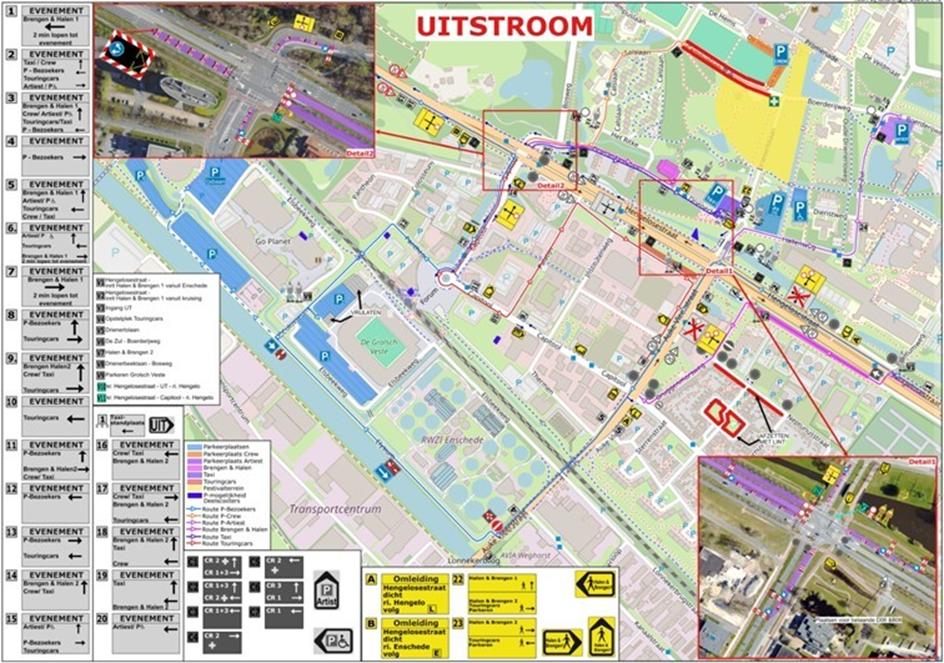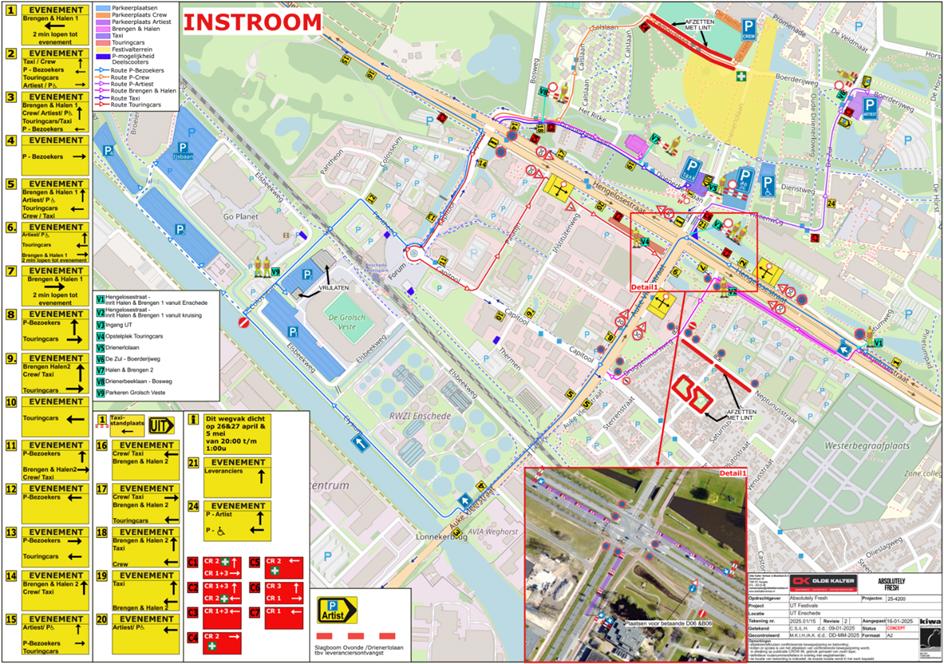 door het plaatsen van de verkeersborden D2 en D3 van bijlage 1 van het RVV 1990 volgens het verkeersplan (zie bebordingsplan), op de Auke Vleerstraat en de Hengelosestraat een gebod tot het volgen van de rijrichting die op het bord is aangegeven op diverse rijstroken die leiden naar een afgesloten wegvak voor de periode van 09:00 tot 02:00 uur, of zoveel korter als mogelijk is of zoveel langer als noodzakelijk, op maandag 5 mei 2025 tot en met dinsdag 6 mei 2025;