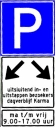 Vaststellen: Parkeergelegenheid (bord E4 conform Bijlage 1 van het RVV 1990 met onderborden OB504 uitsluitend in- en uitstappen bezoekers dagverblijf Karma; OB ma t/m vrij 9.00-17.00 uur"