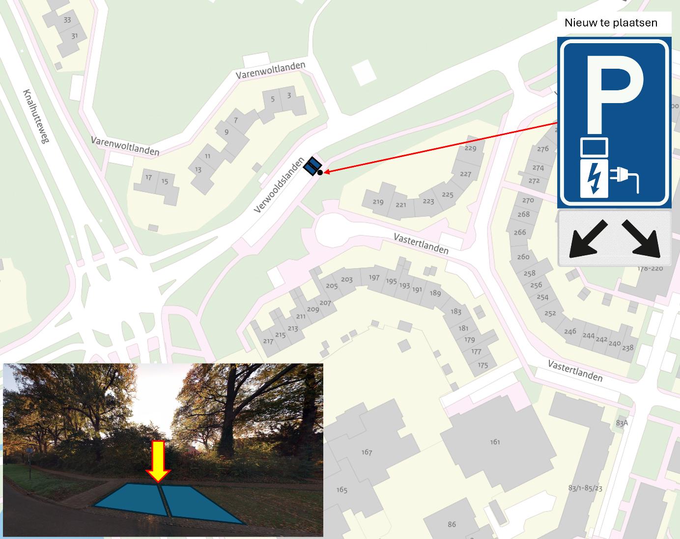 door middel van het plaatsen van het verkeersbord E8c van bijlage 1 van het RVV 1990 met een onderbord met pijlen, waaruit blijkt dat het bord voor twee parkeerplaatsen van toepassing is op de Verwooldslanden ter hoogte van Vastertlanden 219, een tweetal parkeerplaatsen te reserveren ten behoeve van het opladen van elektrische voertuigen.