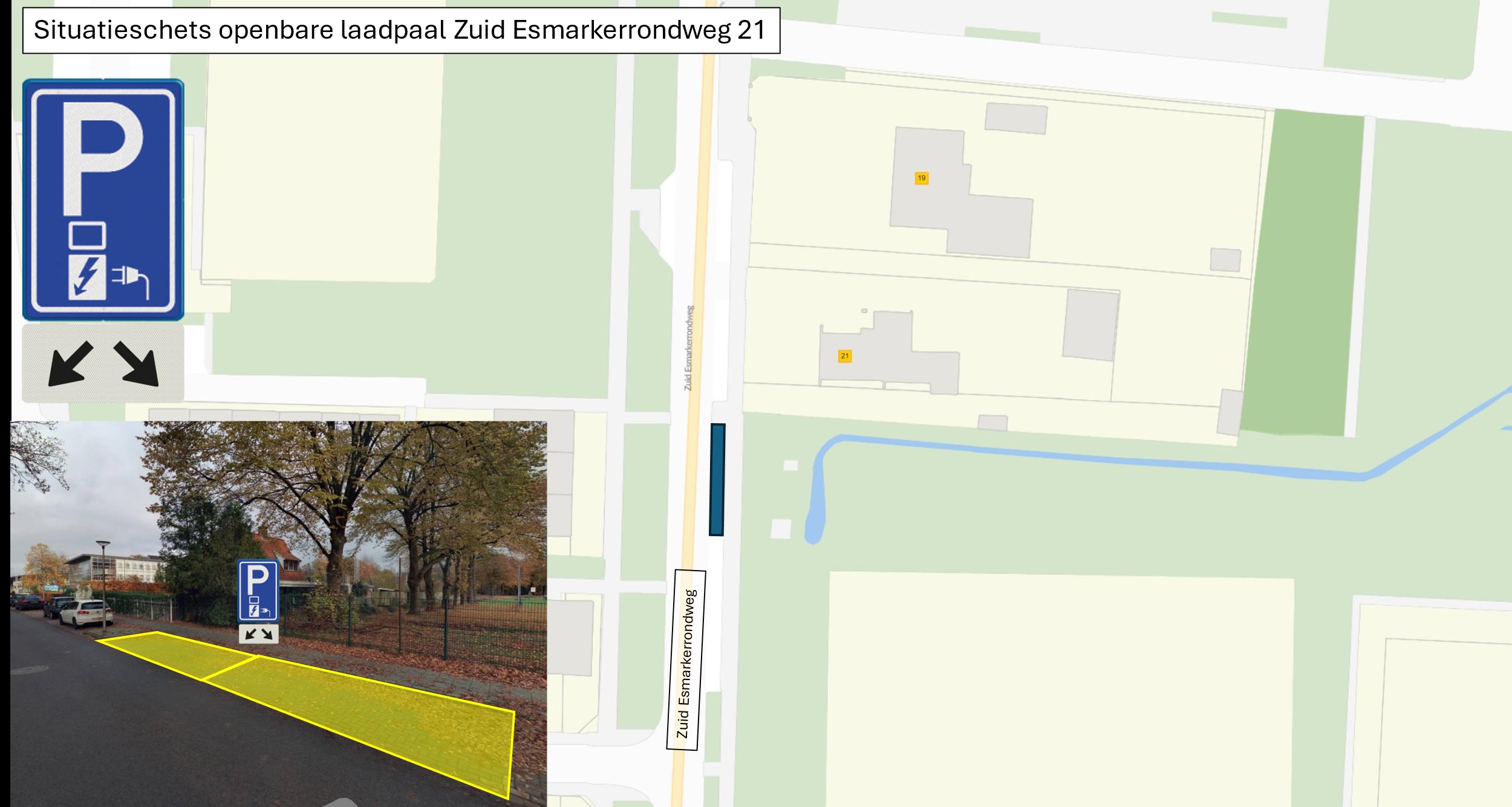 door middel van het plaatsen van het verkeersbord E8c van bijlage 1 van het RVV 1990 met een onderbord met pijlen, waaruit blijkt dat het bord voor twee parkeerplaatsen van toepassing is op de Zuid Esmarkerrondweg ter hoogte van huisnummer 21, een tweetal parkeerplaatsen te reserveren ten behoeve van het opladen van elektrische voertuigen.