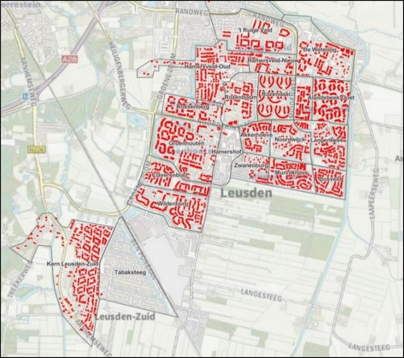 Bij het openen van de applicatie zijn alle woningen die deel mogen nemen rood gekleurd. Dit zijn de grondgebonden woningen in particulier eigendom met een energielabel C tot en met G . Door het klikken op een woning, en het invullen van relevante gegevens, wordt de woning ‘groen’ en daarmee onderdeel van de legalisatie van de ontheffing van de gemeente.