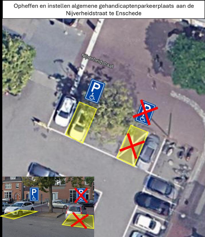 dat er daarom op een alternatieve locatie een algemene gehandicaptenparkeerplaats gerealiseerd wordt op het parkeerterrein aan de Nijverheidstraat door middel van het plaatsen van verkeersbord E6 van bijlage 1 van het RVV 1990;
