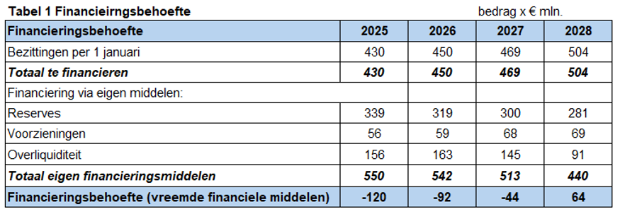 Het resultaat van de te financieren bezittingen -/- de eigen financieringsmiddelen. Dit is het bedrag dat volgens de inschatting met vreemd vermogen gefinancierd moet worden. In de huidige situatie is dit tot en met 2027 negatief. Dat betekent dat er in die jaren geen behoefte is aan (additioneel) vreemd vermogen. Vanaf 2028 is er wel behoefte aan vreemd vermogen.