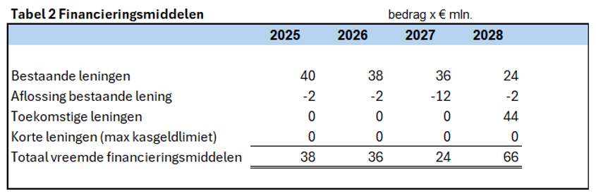 Om in de financieringsbehoefte te voorzien worden leningen aangetrokken. In tabel 2 staat de uitsplitsing van de vreemde financieringsmiddelen voor de jaren 2025 – 2028. Hierin wordt onderscheid gemaakt tussen bestaande leningen en leningen die nog moeten worden aangetrokken. In tabel 2 staat de verwachte omvang aan te trekken leningen op € 44 mln. in 2028. In tabel 1 staat de financieringsbehoefte op € 64 mln. Het verschil betreft de te verwachten instromen in de vorm van specifieke uitkeringen en of subsidies gedurende het jaar. Ook voor deze tabel is aangesloten bij de programmabegroting 2025-2028.