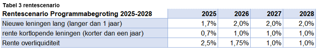 Tabel 3 toont het rentescenario zoals gebruikt voor de programmabegroting 2025-2028. Net als nu het geval is kan er dus een verschil zijn tussen de actuele marktrente (3,2% op het moment van schrijven) en de rente in het scenario. Voor de overliquiditeit wordt de rente zo reëel mogelijk geschat. De reden voor de verschillende benadering is tweeledig. Enerzijds moet de rente voor leningen worden bezien als een structureel fenomeen en de rente over de overliquiditeit als tijdelijk. Anderzijds is er voor het verschil tussen de werkelijke rente en de begrote rente vanuit het scenario een veiligheidsklep in de vorm van de rente egalisatiereserve zie hoofdstuk 4.
