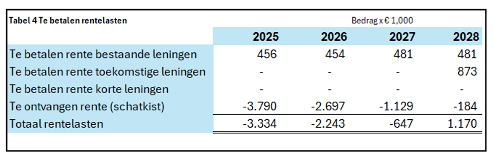 Tabel 4 geeft de geraamde rentelast weer op basis van het rentescenario en de verwachte behoefte aan vreemde financieringsmiddelen uit tabel 2. Het rentescenario is gehanteerd voor de bepaling van de rente op de toekomstige leningen. Voor de bestaande leningen is het werkelijk te betalen rentepercentage, gedurende de restant looptijd, opgenomen. Voor de schatkist is de verwachte overliquiditeit maal het verwacht gewogen gemiddelde rentepercentage genomen. Voor 2025 kom dit dus op (156+163)/2*2,5%= € 3,99 mln. Bij de Programmabegroting 2025 is een voor de rente een meerjarig voordeel verwerkt waarbij is afgerond op € 0,5 mln. waardoor voor de begroting de verwachting met € 0.2 mln. is verlaagd, 3.99-0.2=3,796 mln.