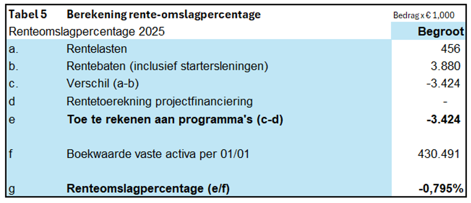 Uit de voorgeschreven berekeningswijze volgt - voor het jaar 2024 - rekening houdend met het totaalbedrag aan boekwaarde van de te financieren activa van ruim € 430 mln. een rente-omslagpercentage van 0%. Op basis van de gegevens voor 2025 bedraagt het rente-omslagpercentage voor 2025 0%. Dat percentage is gehanteerd voor de meerjarenbegroting 2025-2028.