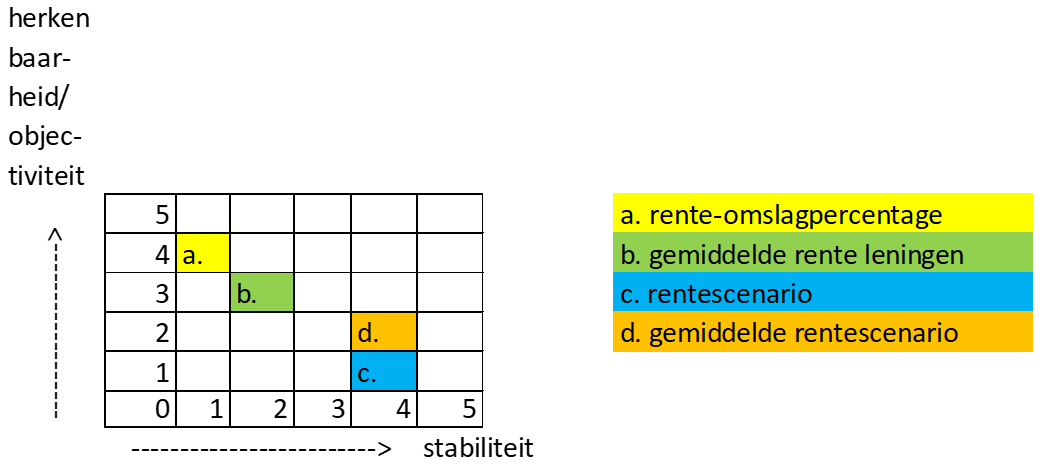 Stabiliteit: De uitkomst van de berekening van het rente-omslagpercentage is afhankelijk van altijd wisselende omstandigheden en zal daarmee dus jaarlijks (sterk) variëren. Daarmee een lage score op het criterium stabiliteit.