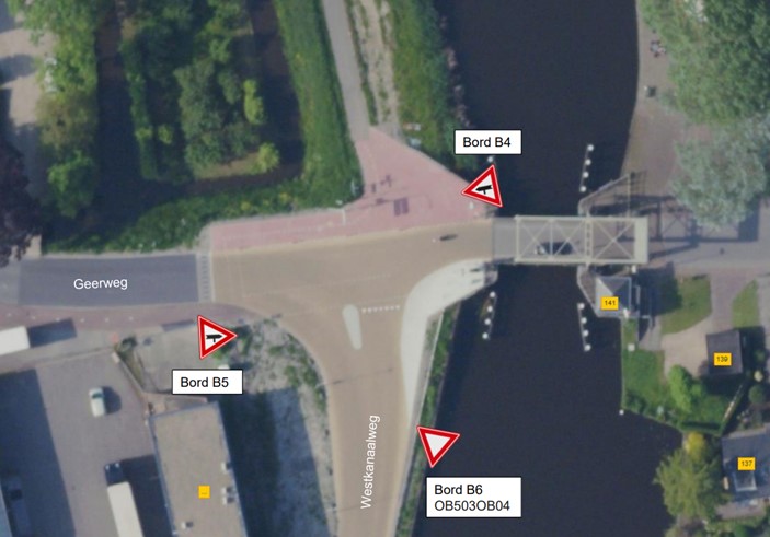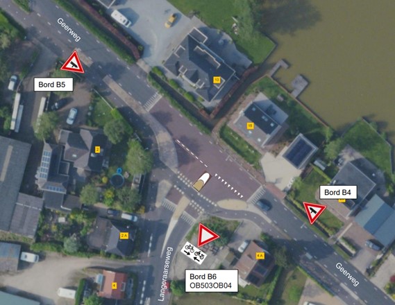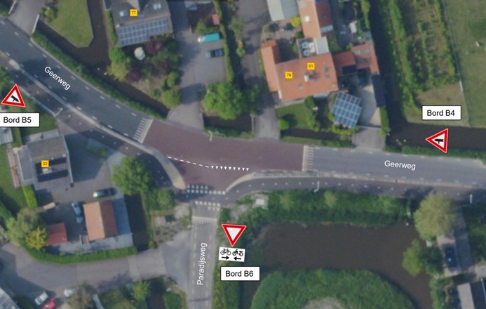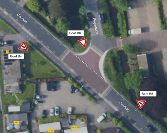 Kruispunt Geerweg/Reigerbos in combinatie met waarschuwingsborden B04 & B05