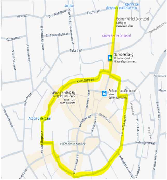 Centrumgebied Oldenzaal: het gebied omsloten door de Kloosterstraat, Ootmarsumsestraat (tot aan de Eschstraat), Oostwal, Walstraat, Monnikstraat, Paradijsstraat, Ganzenmarkt, Gasthuisstraat, Kortestraat, Deurningerstraat, Langestraat, Vestingstraat zoals aangegeven op de kaart, met inbegrip van voornoemde straten voor zover aangrenzend aan het omsloten gebied.