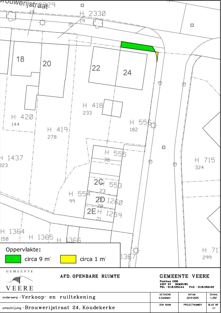 Aankondiging voorgenomen verkoop door gemeente Veere van een reststrook nabij de Brouwerijstraat 24 te Koudekerke, ter grootte van ongeveer 9 m2, thans nog deel uitmakende van het perceel kadastraal bekend gemeente Valkenisse, sectie H nummer, 2620.
