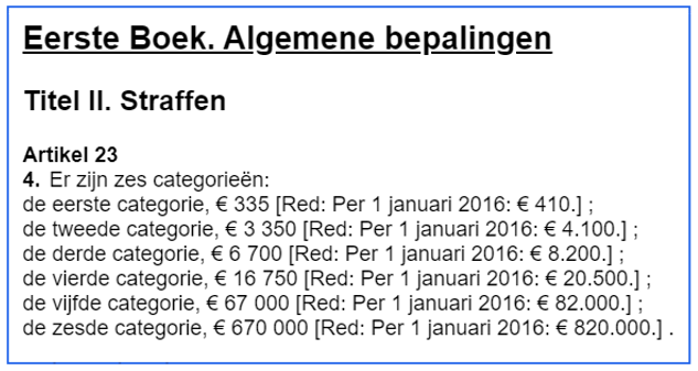 Voor de bedragen sluit het college aan bij de categorieën genoemd in artikel 23 lid 4 van het Wetboek van Strafrecht.