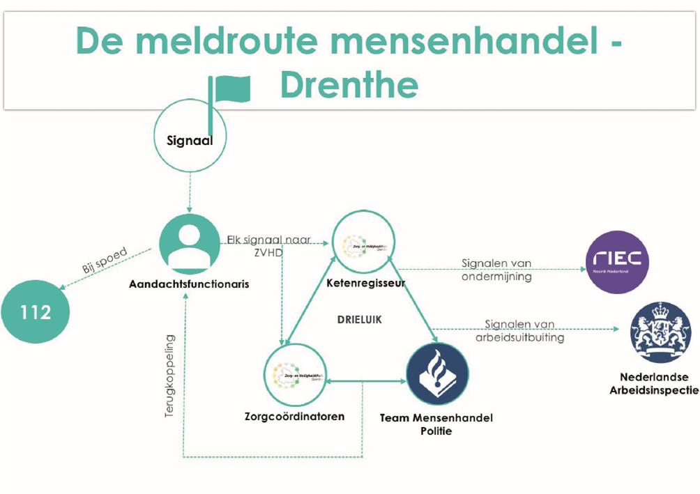 Signalen van mensenhandel komen onder meer terecht bij de Drentse gemeenten, het ZVHD (via de ketenregisseur of de zorgcoördinatoren) en bij TMM van de politie. Alle Drentse gemeenten hebben een aandachtfunctionaris. Wanneer zij signalen van mensenhandel ontvangen, schakelen zij met de ketenregisseur of met de zorgcoördinatoren (tenzij er sprake is van spoed, dan wordt direct 112 gebeld, waarna achteraf contact wordt opgenomen met de ketenregisseur of met de zorgcoördinator). De signalen worden vervolgens besproken binnen het Drieluik-overleg; het overleg tussen de ketenregisseur, de zorgcoördinatoren en TMM. Signalen met een ondermijnende component worden ingebracht bij het RIEC ten behoeve van een integrale aanpak. Signalen van arbeidsuitbuiting worden opgepakt door de NLA. Signalen van criminele en seksuele uitbuiting worden door TMM opgepakt.