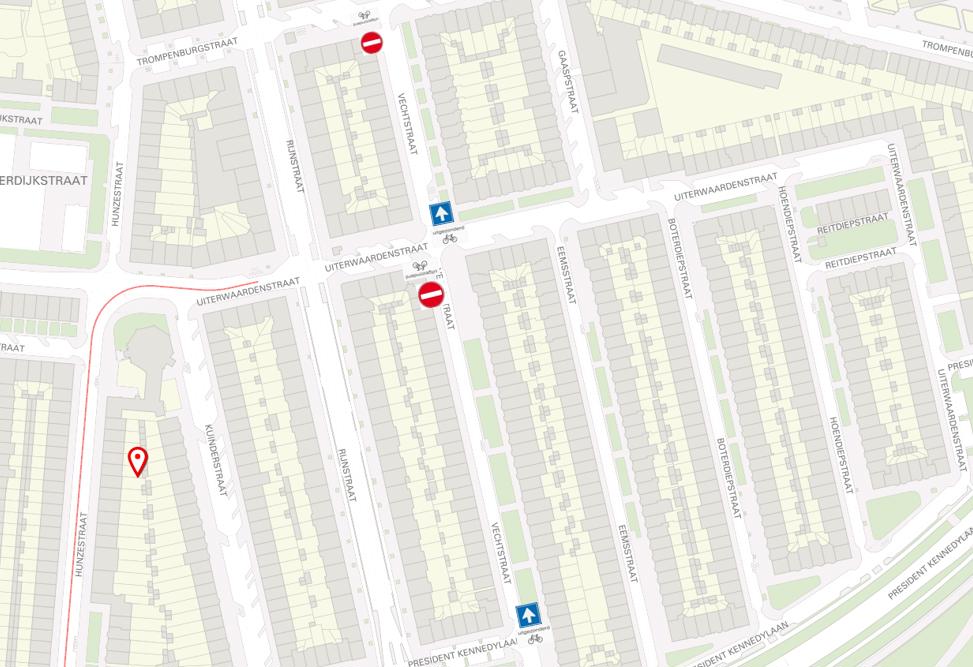 Door het plaatsen van verkeersborden conform model C2 en C3 van Bijlage I van het RVV 1990, met onderborden OB52 (uitgezonderd fiets) aan te wijzen: een eenrichtingsweg, in deze richting gesloten voor voertuigen, ruiters en geleiders van rij- of trekdieren of vee, uitgezonderd fiets, in de Vechtstraat, het deel tussen de ventweg van de President Kennedylaan en Trompenburgstraat.