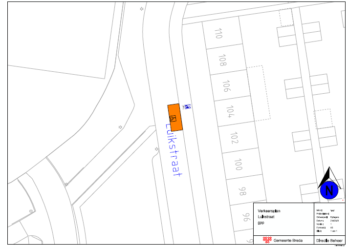Een gehandicaptenparkeerplaats op kenteken aan te wijzen in de Luikstraat ter hoogte van huisnummer 104 te Breda. Een en ander zoals weergegeven op de bijgevoegde tekening ‘Verkeersplan Luikstraat gpp’.