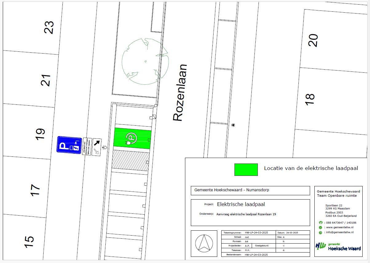 Twee parkeerplaatsen aan te wijzen voor het uitsluitend opladen van elektrische voertuigen, waarbij aanvankelijk slechts één parkeerplaats wordt geëffectueerd. Dit door middel van het plaatsen van het bord E8c van het RVV (Reglement Verkeersregels en Verkeerstekens 1990) voorzien van het onderbord met de tekst ” Uitsluitend voor elektrische voertuigen tijdens het opladen”.