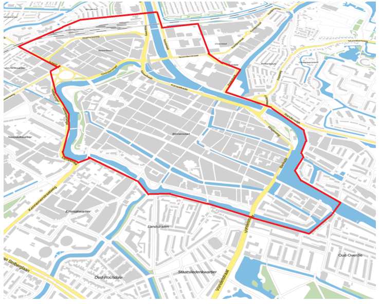 Kaart behorende bij “Besluit gebiedsaanwijzing verbod openlijk harddrugsgebruik centrum Alkmaar, Sportbuurt en Overstad”
