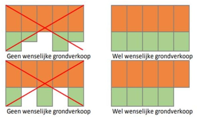 Er dienen logische perceelgrenzen te ontstaan. Logische perceelgrenzen wil zeggen dat indien het openbaar groen grenst aan percelen van verschillende eigenaren de strook in zijn geheel verkocht dient te worden. Zogenoemde versnippering/kantelenvorming is onwenselijk. Dit geldt voor stroken grond aan alle zijden van een perceel. Als één of meerdere bewoners geen belangstelling hebben, wordt aan de hand van de feitelijke situatie bekeken of al dan niet tot verkoop kan worden overgegaan. Figuur 1 schetst de situaties waarin verkoop wel of niet wenselijk is