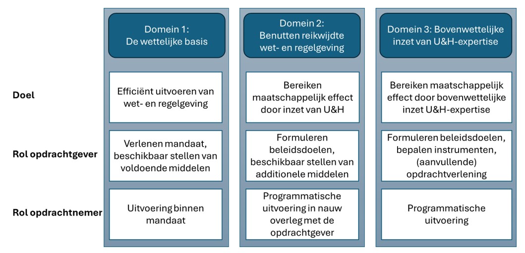 In het rapport ‘Handreiking Outcome gericht werken’7 , d.d. 21 november 2023, worden drie domeinen genoemd die helpen om op een opdracht te monitoren en hierover te rapporteren. Deze domeinen worden vanaf 2024 door het IBP VTH verder geïntroduceerd bij omgevingsdiensten. In bijlage 1 worden de domeinen nader toegelicht.