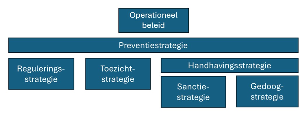 Het strategisch beleid (wat willen we bereiken?) werkt door naar operationeel beleid (hoe willen we dit bereiken?). Dit operationeel beleid is uitgewerkt in enkele deelstrategieën. Dit betreft: de preventiestrategie, de reguleringsstrategie, de toezichtstrategie, en de handhavingsstrategie (die bestaat uit de sanctiestrategie en de gedoogstrategie). Deze strategieën opereren naast elkaar, en sluiten elkaar niet uit. Bij het opstellen van het uitvoeringsprogramma wordt bepaald welke verhouding tussen de strategieën voor het betreffende jaar het meest aangewezen is. Dit gebeurt in overleg tussen de deelnemers en de FUMO. De methodiek van de ‘Tafel van Elf’, waarbij in eerste instantie aandacht uitgaat naar het voorkomen van overtredingen door zo passend mogelijke preventieve inzet, biedt hiervoor een analysetool.