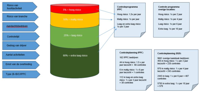 Het uitvoeringsprogramma gaat uit van risicogericht werken. Op verzoek van de deelnemers is een risicomodel opgesteld door Arena Consulting dat niet alleen uitgaat van de standaardcriteria zoals natuur, financieel, gezondheid, imago, ed. Naast criteria als naleefgedrag en de laatste keer dat een locatie op het gebied van toezicht is bezocht, is gelijk aan 2024 ook rekening gehouden met de ernst van overtredingen en het aantal meest waarschijnlijke milieubelastende activiteiten die zijn toegekend per locatie.