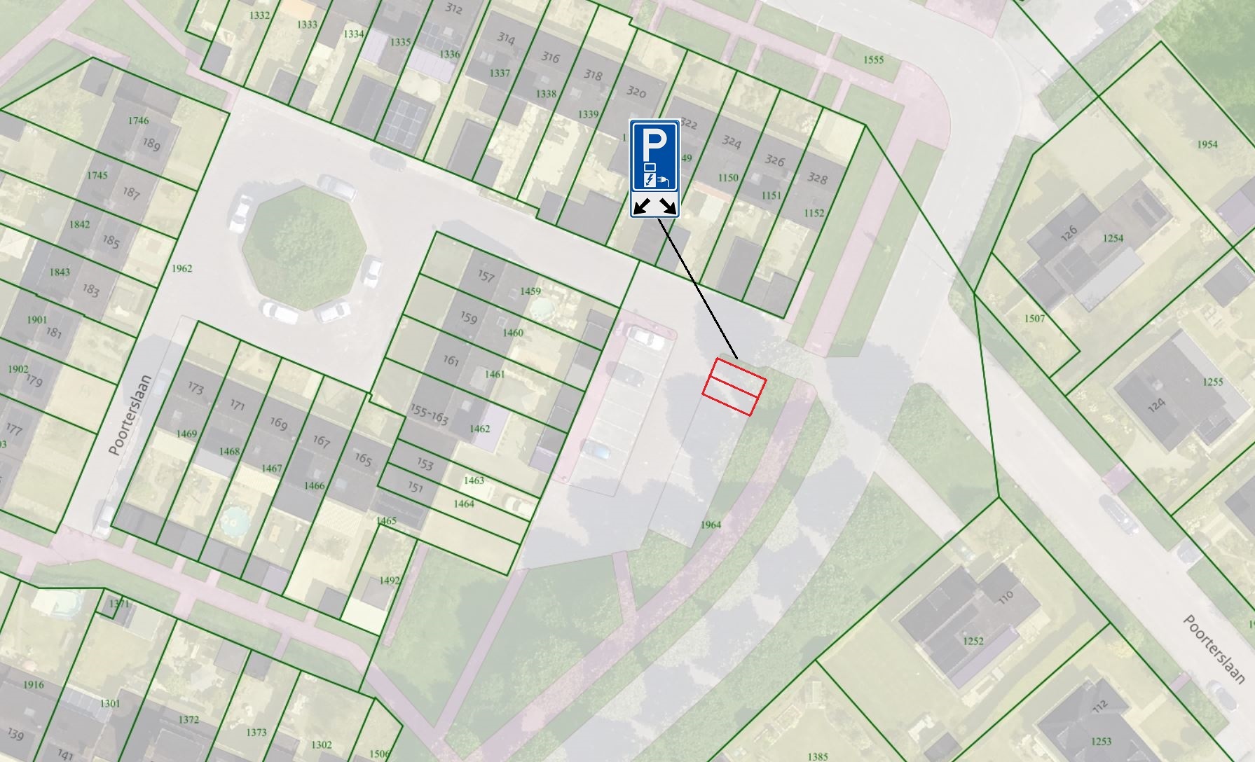 tot het aanwijzen van de volgende parkeervakken, uitsluitend voor elektrische personenauto's, nabij het aan te brengen oplaadpunt bij de 2 op tekening aangegeven, meest noordoostelijk gelegen vakken op het parkeerterrein aan de Poorterslaan te Hulst, middels plaatsing van bord E08c “laden elektrische auto” en onderbord OB504 van bijlage I behorende bij het ‘Reglement Verkeersregels en Verkeerstekens 1990’.