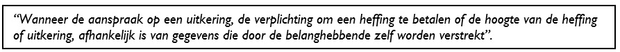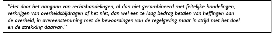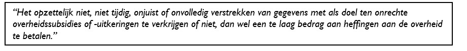 Het opzettelijk niet, niet tijdig, onjuist of onvolledig verstrekken van informatie betreft een bewuste misleiding om een onrechtmatig of onwettig voordeel te behalen. Misbruik kan gelijk worden gesteld met het plegen van fraude om zich onrechtmatig overheidsgelden toe te eigenen.