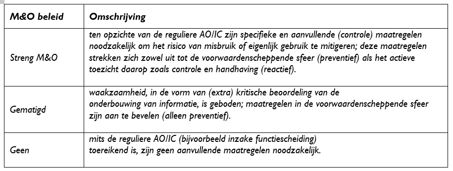De intensiteit van het M&O-beleid hangt samen met de hoogte van het risico. Wanneer het risico laag is zal weinig tot geen specifiek M&O-beleid nodig zijn. Naarmate het risico hoger wordt, zal het M&O-beleid strenger moeten worden. In dat kader is een onderscheid gemaakt in: