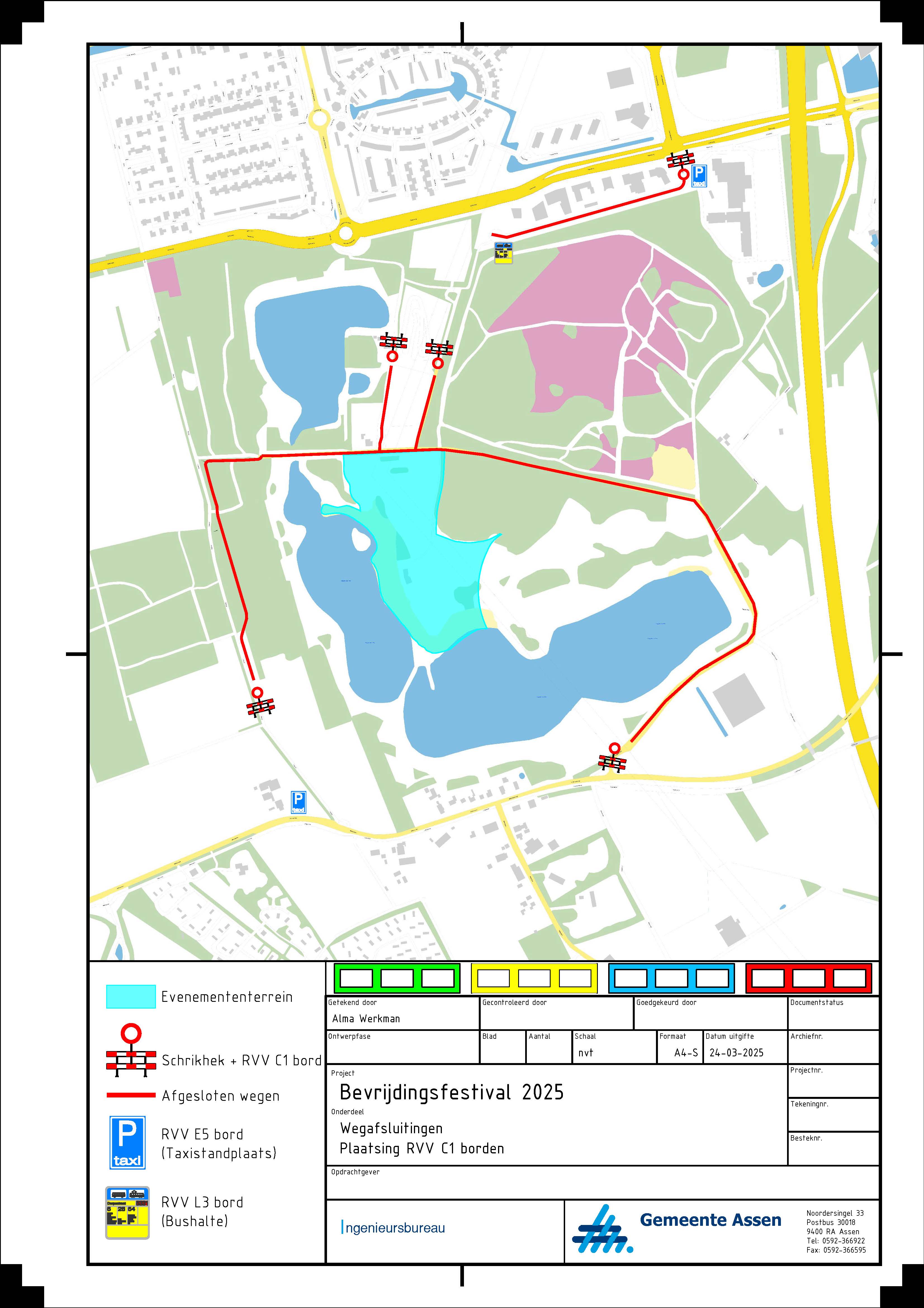 Voor het evenement Bevrijdingsfestival Assen een geslotenverklaring in te stellen door het plaatsen van hekken en het bord C1 (gesloten in beide richtingen voor voertuigen, ruiters en geleiders van rij- of trekdieren of vee) van bijlage 1 van het RVV 1990 op de volgende tijdstippen en locaties: