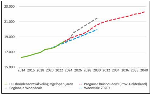 Figuur 2.1: Gemeente Nijkerk. Verwachte huishoudensontwikkeling (2024-2040), vergeleken met ambitie Woondeals en ambitie Woonvisie 2020+