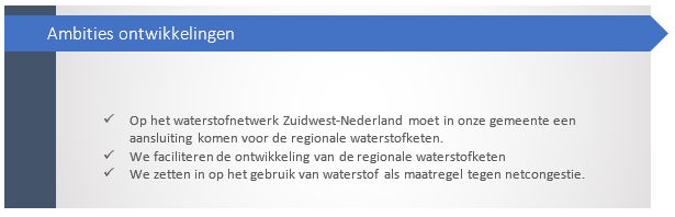 Voor de hoofdtransportinfrastructuur van waterstof is Gasunie met haar dochteronderneming Hynetwork Services aangewezen als netbeheerder. Voor de regionale- en lokale infrastructuur zijn nog geen netbeheerders aangewezen. Commerciële partijen mogen dus ook waterstofinfrastructuur aanleggen. Vanwege het strategische belang van deze netwerken is het gewenst dat de aanleg en beheer in de openbare ruimte bij een aangewezen netbeheerder komt te liggen. De hierbij aan veiligheid, leveringszekerheid en netinpassing. Daarnaast kan het huidige aardgasnetwerk een rol spelen een toekomstig waterstofnet. Bij de aanleg van een regionaal- of lokaal waterstofnet in onze gemeente gaat de voorkeur uit dit in samenwerking te doen met Stedin, de netbeheerder in Zeeland.