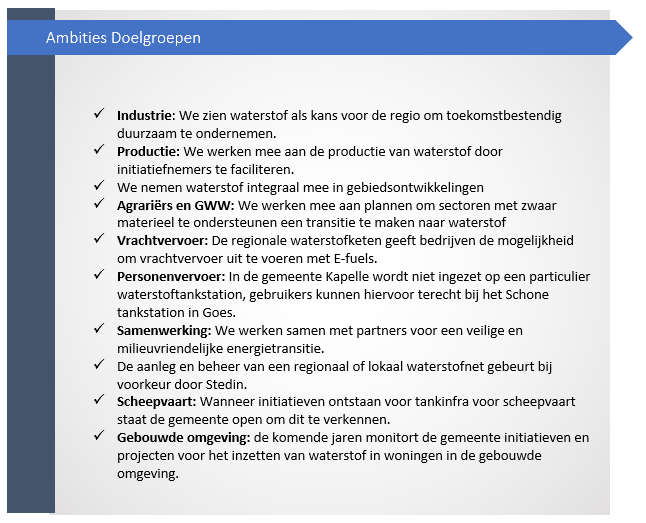 De gemeente Kapelle erkent het belang van een transitie naar duurzame energiebronnen. In lijn met nationale en internationale klimaatdoelstellingen streeft de gemeente ernaar om de productie en het gebruik van grijze en blauwe waterstof te verminderen en uiteindelijk volledig over te stappen op groene waterstof.
