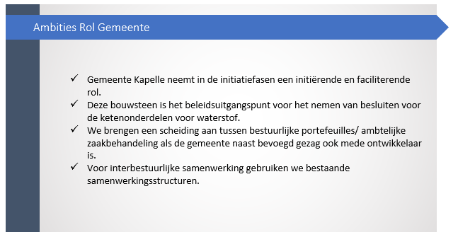 Gemeente Kapelle neemt in de initiatiefasen een initiërende en faciliterende rol. Daarmee worden beleids- en investeringskaders voor het project neergezet, middels maatschappelijk en politiek draagvlag. Dit biedt initiatiefnemers voldoende ruimte voor de uitvoering van verschillende innovatieprojecten. In deze fase organiseert de gemeente regie en sturing, om vervolgens in de uitvoering van de projecten een ondersteunende rol te kunnen nemen, zoals het bevoegd gezag voor het afgeven van de benodigde vergunningen.