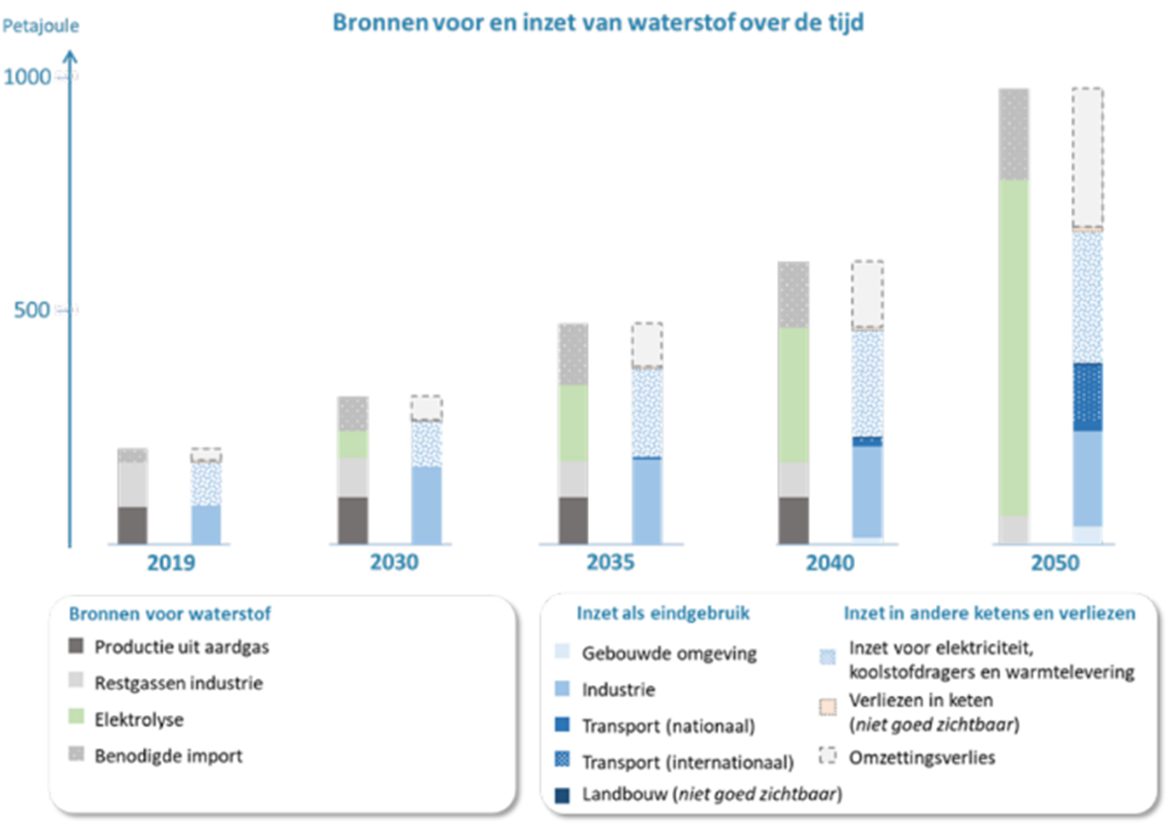 In de periode tot 2030 groeit de waterstofbehoefte vanuit de industrie. Het grootste deel van de waterstofinzet zal nog een fossiele basis hebben, waarbij mogelijk CCS (afvang en opslag van CO2) wordt toegepast. Het kabinet zet in op innovatie en opschaling van elektrolyse tot 4 GW in 2030 en sterke opschaling van CO2-vrije elektriciteit. Er komen steeds vaker momenten dat overvloedige elektriciteitsproductie kan worden omgezet in groene waterstof. De groeiende waterstofbehoefte wordt aangevuld met import, zodat tenminste voldaan wordt aan de eisen uit de hernieuwbare energie-richtlijn. Er wordt een landelijk transportnet aangelegd om vraag en aanbod te verbinden. Waterstofproductie gebeurt richting 2035 deels direct op zee. Richting 2040 zet het kabinet in op een elektrolysecapaciteit van 15 - 20GW.