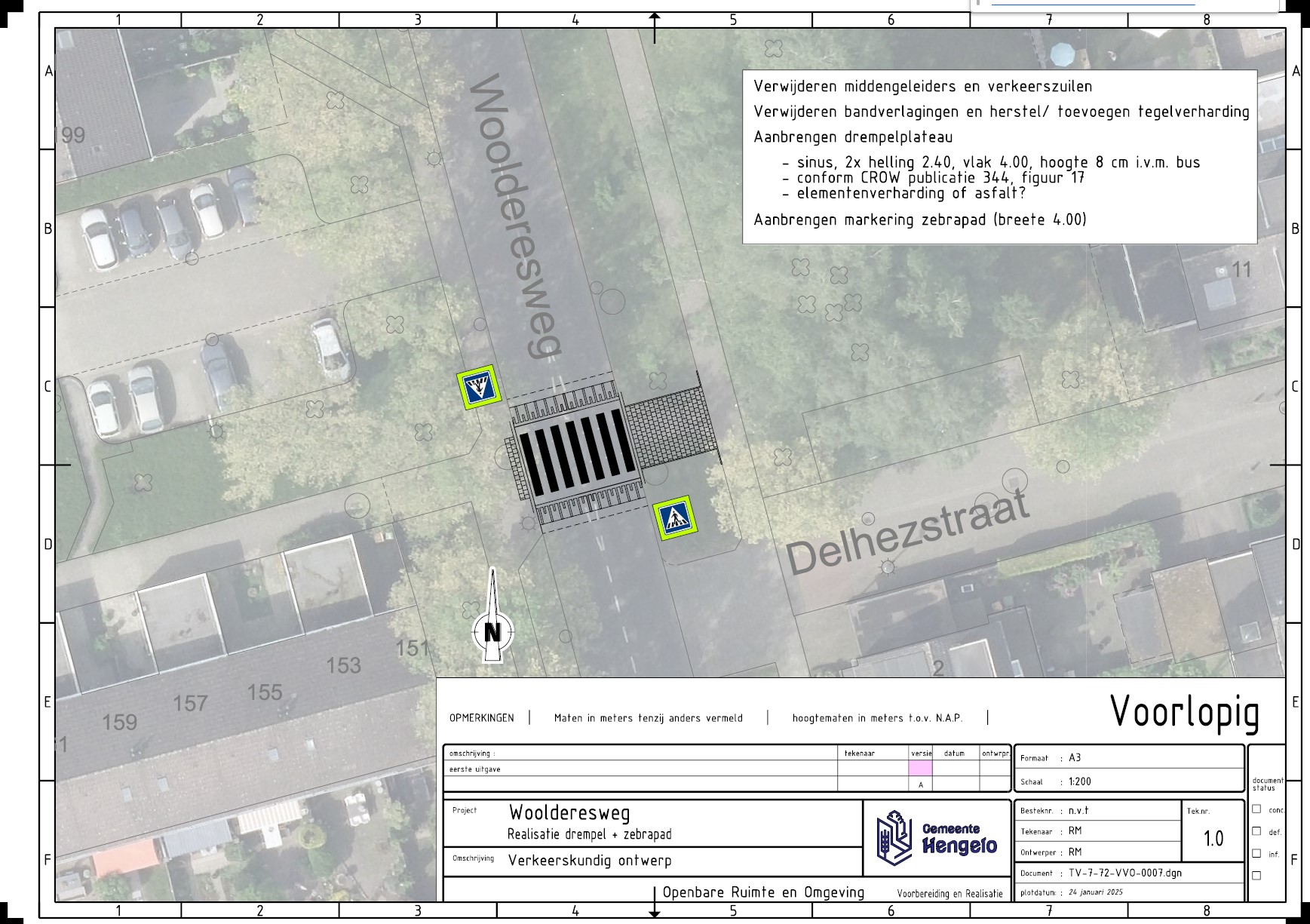 De voetgangersoversteek in de Woolderesweg, ter hoogte van de Delhezstraat, wordt door scholieren van de IKC Wooldermarke gebruikt om van en naar de gymzaal te lopen. Voetgangers worden bij het oversteken van de Woolderesweg geregeld niet voorgelaten, terwijl het wel gewenst is dat de gehele klas in één keer kan oversteken. De school treft al veiligheidsmaatregelen door leerkrachten in een fluoriderend hesje de oversteek van de gehele klas te laten begeleiden. Echter hebben de leerkrachten formeel geen bevoegdheid om verkeer te mogen regelen. De juridische verkeerssituatie sluit niet aan bij het gewenste verkeersgedrag.