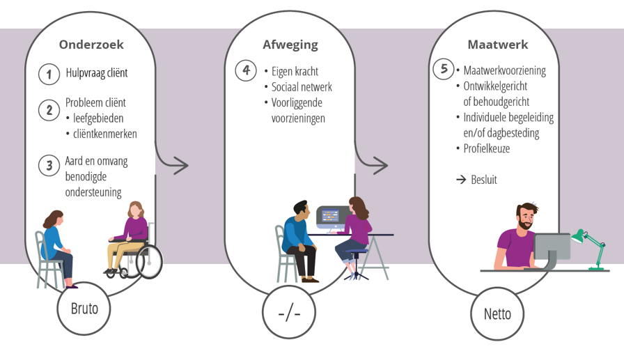 Als een cliënt2 om ondersteuning vraagt, doet de gemeente hier onderzoek naar. De gemeente onderzoekt de gehele ondersteuningsbehoefte van de cliënt. Bepaalt daarna wat de mogelijkheden zijn om hierin te voorzien vanuit eigen kracht, het netwerk en overige voorliggende voorzieningen. Om tot slot te bepalen welke maatwerkvoorziening hierop aanvullend nodig is. Deze maatwerkvoorziening (ondersteuning op maat van het individu) wordt vastgelegd in een beschikking ofwel een indicatie. De cliënt ‘verzilvert’ de indicatie vervolgens ‘in natura’ en/of met een persoonsgebonden budget.