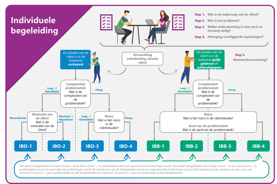 In stap 5b kiest de Wmo-consulent op basis van alle over de cliënt verzamelde informatie het voor deze cliënt best passende profiel. Dit doet de Wmo-consulent op basis van het totaalbeeld uit stap 2: de problemen van de cliënt, de scoring op de leefgebieden en de scoring op de overige cliëntkenmerken. Dit kunnen ook twee profielen zijn: één voor individuele begeleiding en één voor dagbesteding. Hierna geven we een nadere beschrijving van deze twee typen profielen.