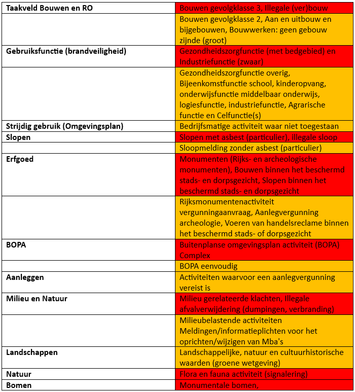 Een lage prioriteit betekent dat aanvragen om vergunning en meldingen op basisniveau worden getoetst. Toetsing vindt hoofdzakelijk plaats op volledigheid en globaal op de onderdelen. Het toezicht op deze taken en activiteiten is minimaal. Het toezicht vindt hoofdzakelijk plaats op basis van een klacht, melding of handhavingsverzoek.