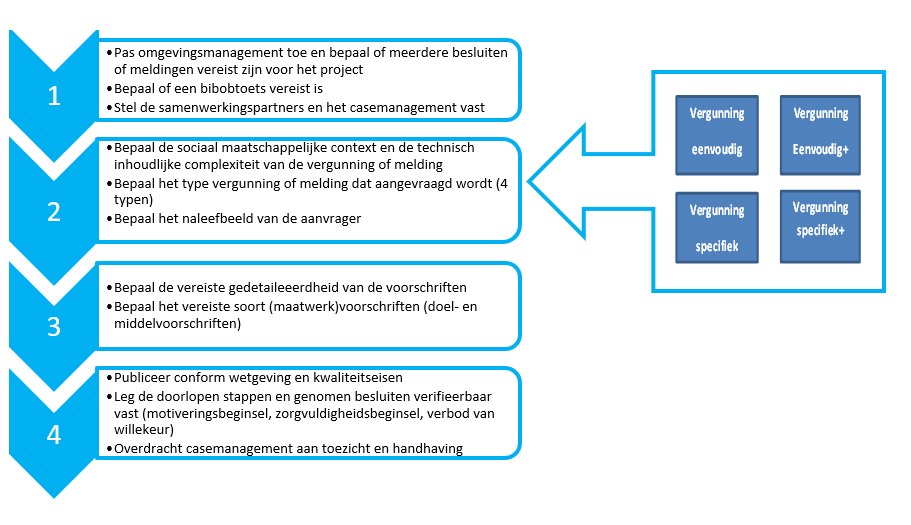 Onder de Omgevingswet is een vergunning eerder uitzondering dan regel. Veel activiteiten kunnen legaal uitgevoerd worden door vooraf een melding in te dienen of aan de informatieplicht te voldoen. Voor deze producten volgen wij de wettelijke eisen en vastgestelde beleidsuitgangspunten. We stellen heldere, transparante en handhaafbare vergunningen op en verlenen ze binnen de gestelde termijn (onder de Omgevingswet meestal regulier, 8 weken). Initiatiefnemers hebben een eigen verantwoordelijkheid om aan hun verplichtingen te voldoen. Bij initiatieven waar meerdere vergunningen of toestemmingen voor nodig zijn, stemmen we zoveel mogelijk af met andere bevoegde overheden en omgevingsdiensten. Daarbij functioneren wij als procesbegeleider, ook wel casemanager genoemd. De initiatiefnemer is verantwoordelijk voor het aanvragen van zijn product. Dit doen we vanuit de 1-loket-gedachte. Hiermee voorkomen we dat we een activiteit deels vergunnen, maar deze op basis van andere wetgeving toch niet mag. Het vooroverleg is hierbij een belangrijk onderdeel. In de kwaliteitseisen heet dit vereiste “casemanagement”.