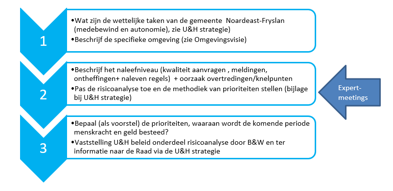 De beleidsmatige keuzes ten aanzien van de U&H-taken die Noardeast-Fryslân de komende vier jaar uitvoert zijn in de geactualiseerde risicoanalyse opnieuw vastgelegd2. Met de risicoanalyse is de vraag WAT wij belangrijk vinden beantwoord en in de U&H strategie en het jaarlijks uitvoeringsprogramma beschrijven wij HOE wij de prioriteiten van een aanpak voorzien.
